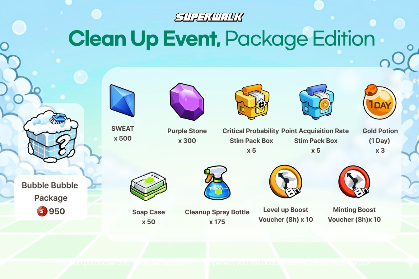 ・1分毎にアイテム獲得確率(幸運度[Luck])に応じて、「Cleanup Detergent」を1個獲得。