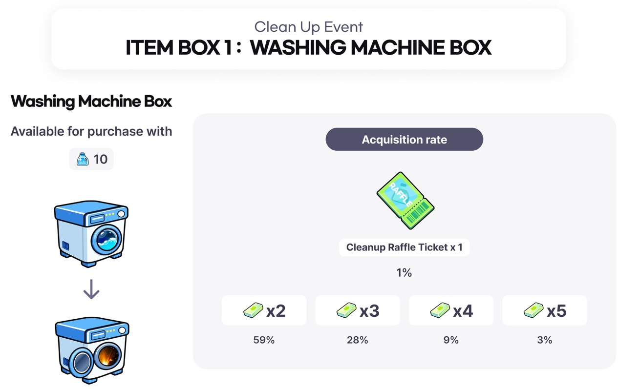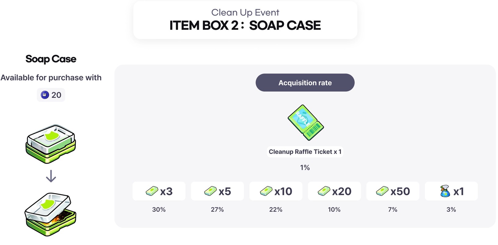 - Cleanup Soapは、称号、スキン、スキンボックス、ラッフルチケットと交換できます。