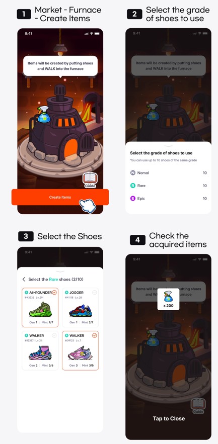 - 「アイテム作成」を行うには、シューズNFTとWALKが必要です。