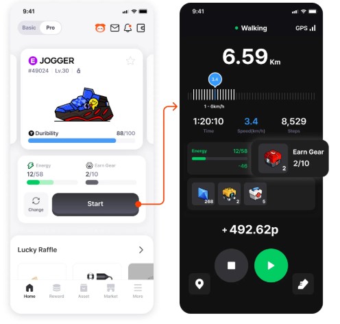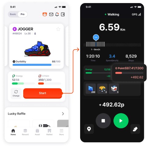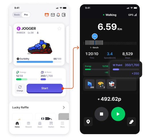 ・例えば、WALK採掘モードを利用するユーザーの皆さまには毎日、ギフト券、SuperWalkTシャツ、実際のシューズ、ランニング用品といったような日常生活ですぐに使える報酬を支給します。