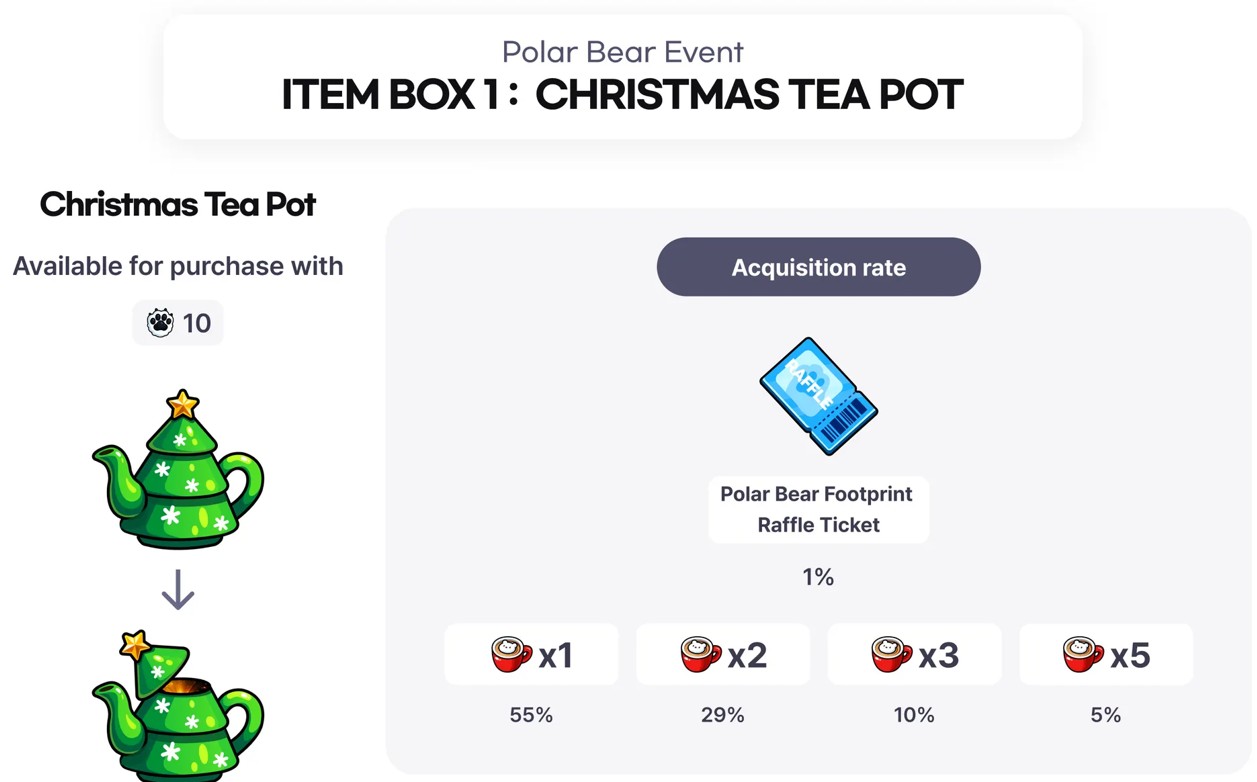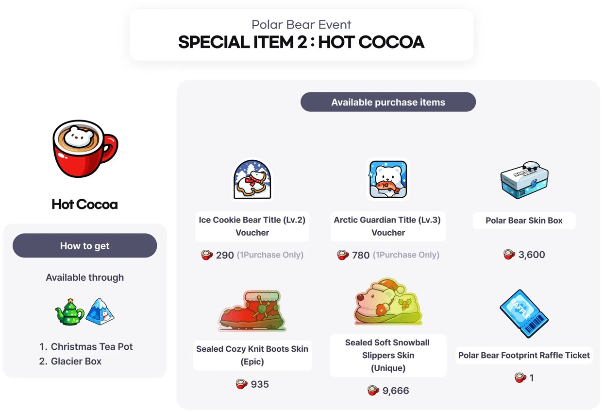 - Hot Cocoaは、「Christmas Tea Pot」と「Glacier Box」を通して獲得できます。