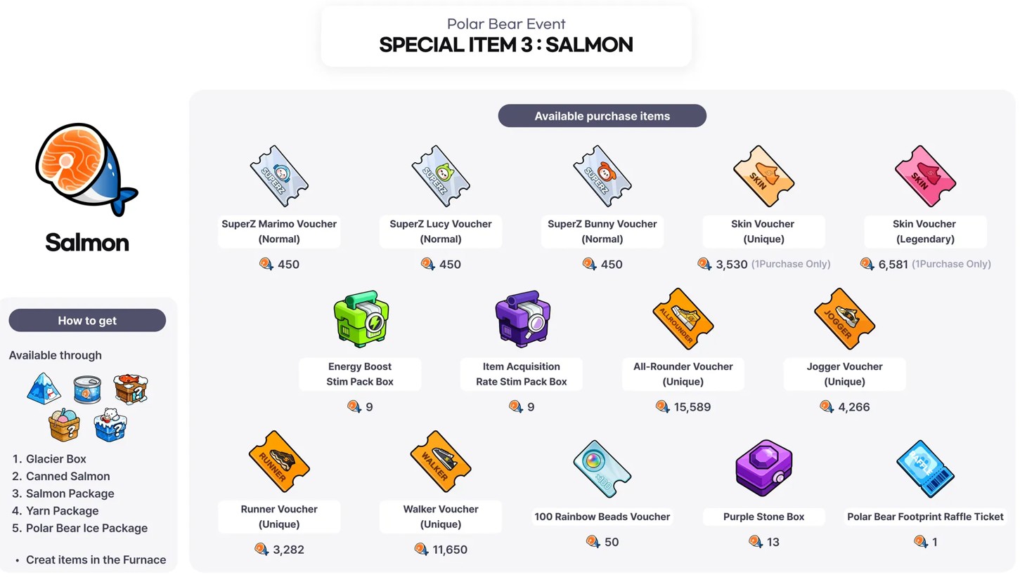 - Salmonは、溶鉱炉での「アイテム作成」や「Glacier Box」「Canned Salmon」を購入して獲得できます。