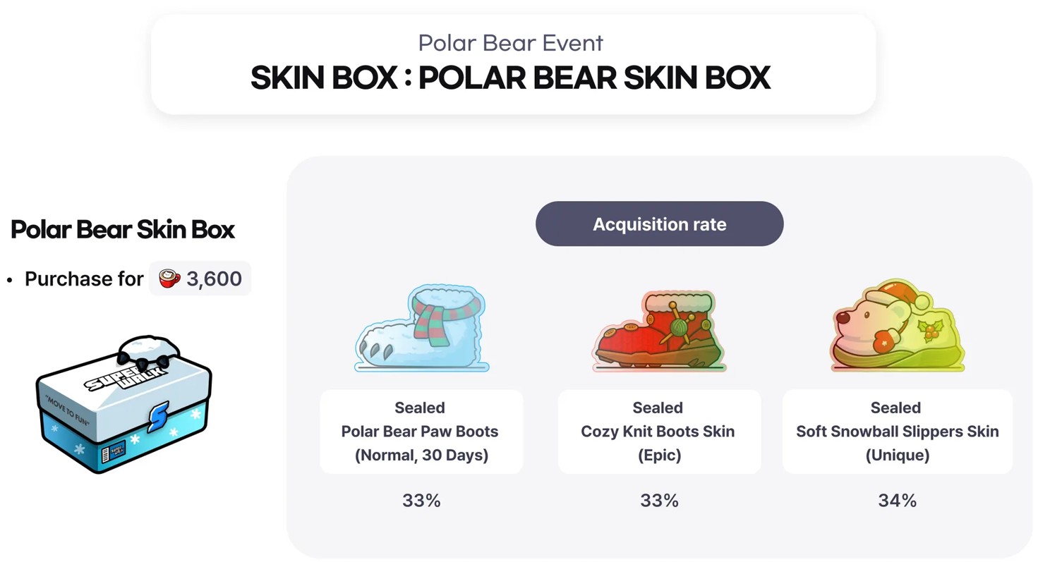 - 「Polar Bear Skin Box」を開封して、様々なスキンを獲得できます。