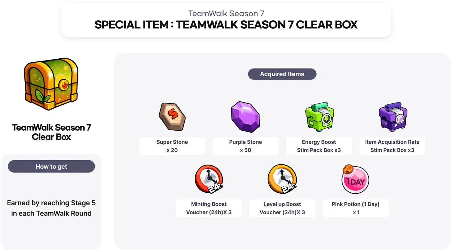・各ラウンドごとにチームがステージ5を達した場合、そのチームのメンバー全員に「TeamWalk Season Clear Box1個」が郵便箱にされます。