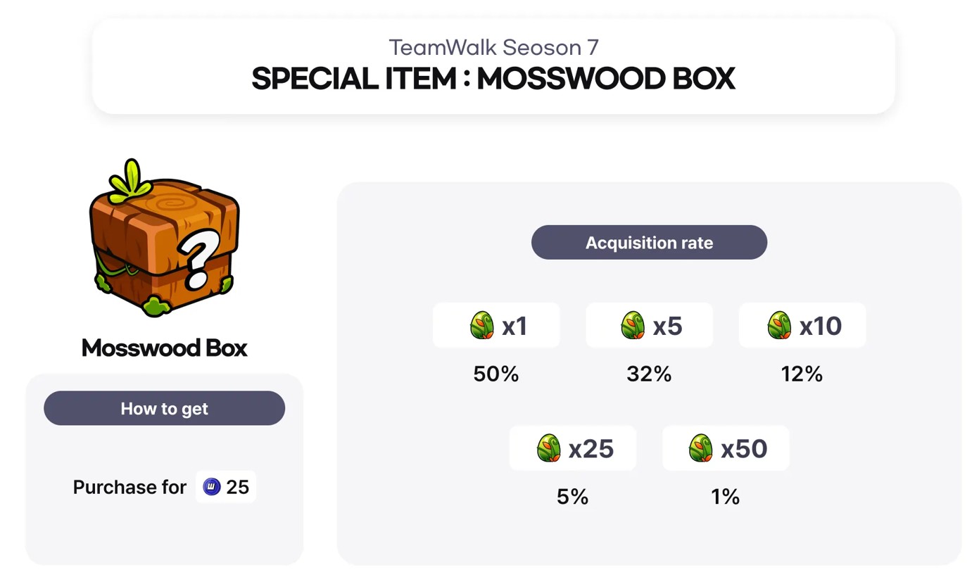 - Mosswood Boxは、TeamWalk Passの報酬を通して獲得、または25WALKで購入することができます。