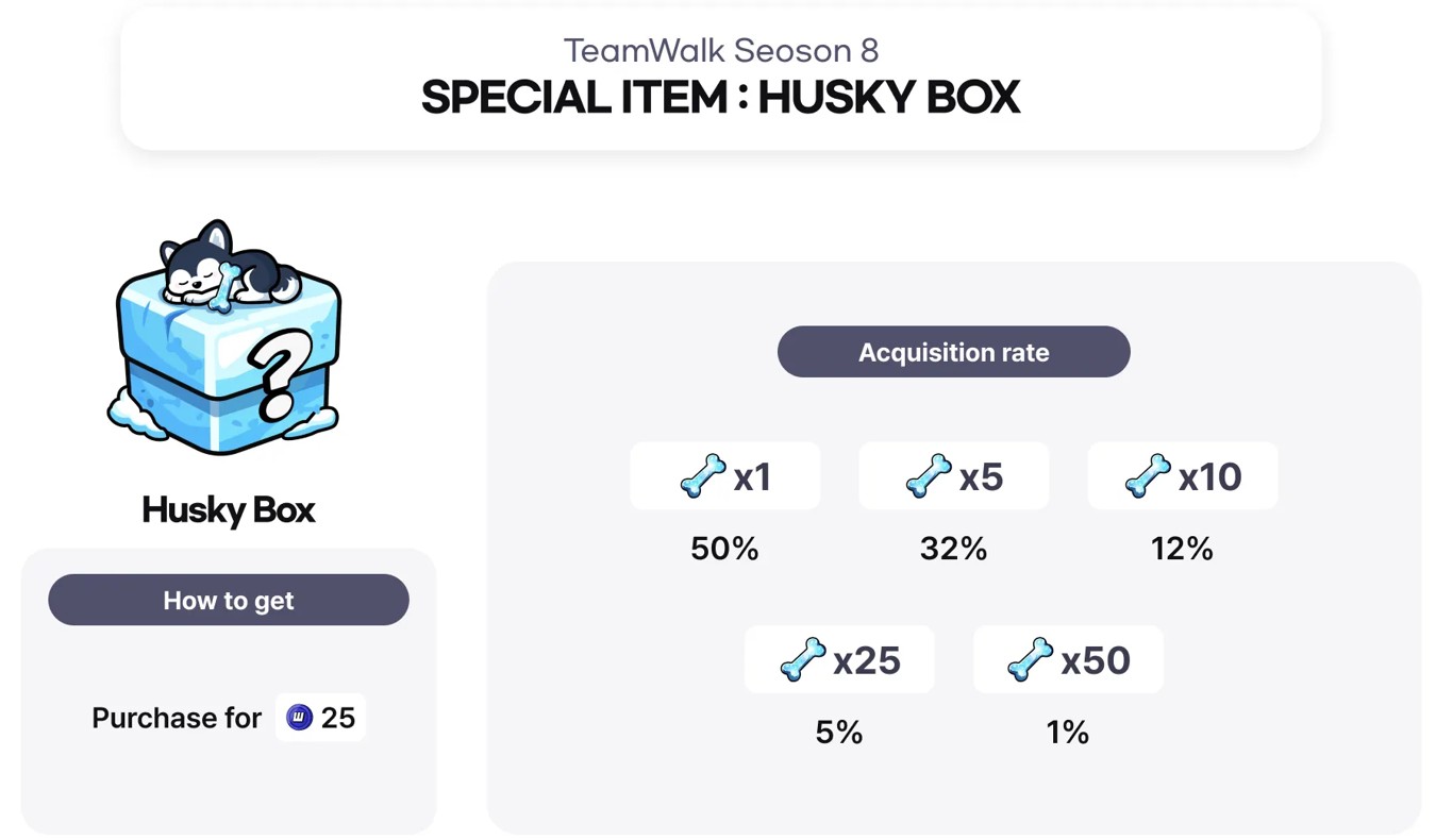• Husky Boxは、イベントラッフルを通して獲得、または25WALKで購入することができます。