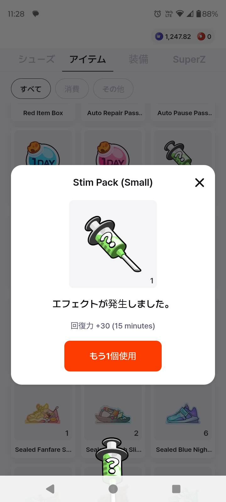 • Stim Packは「もう1個使用」をタップし、連続して使用することも可能です。なお、連続してStim Packを使用した場合、「その他」→「Myステータス」→「スティムパック効果」にある使用予定リストに追加されます。