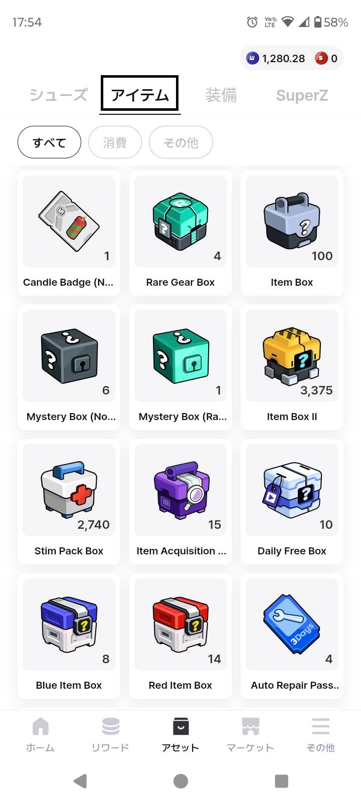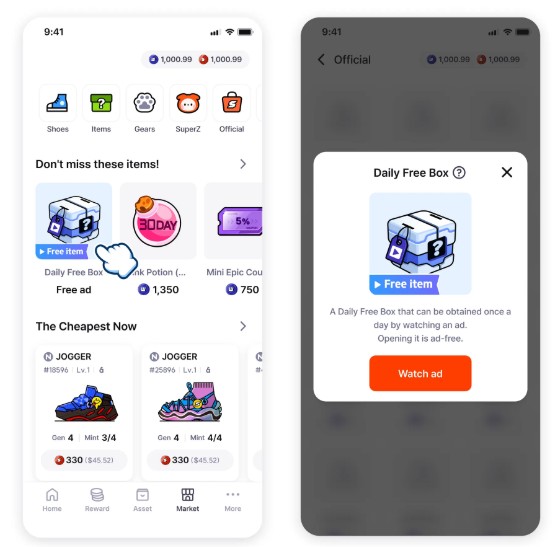 ユーザーは運動やイベント、ラッフルなどを通してアイテムボックスを獲得することができ、そのアイテムボックスからは様々なアイテムを獲得できます。
