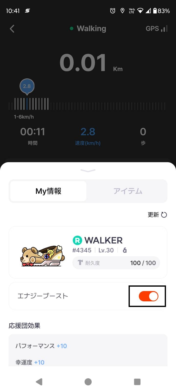 エナジーブーストの適用を中断したい場合には、運動画面のシューズのマークをタップすると表示されるエナジーブーストの項目で、ON/OFFを切り替えることもできます。
