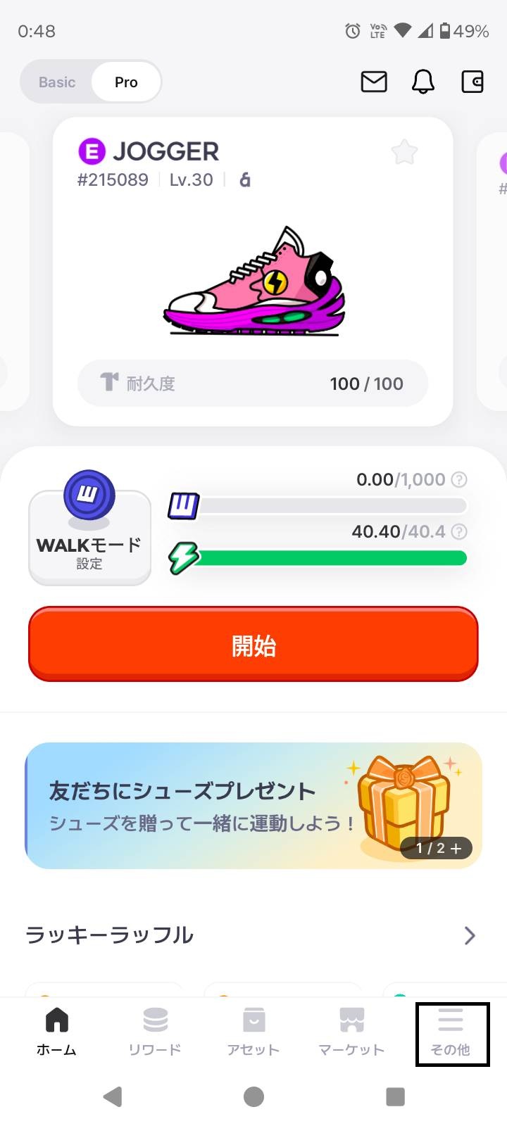 ![]() JOGGER | JoggerのシューズNFTで〇〇km運動する ※エナジーを消費した分のみカウントされます。 ※シューズの目標速度を合わせて50%以上(1分に30秒以上)運動した場合のみカウントされます。 | レベル1:3km レベル2:30km レベル3:100km レベル4:300km レベル5:500km レベル6:1,000km レベル7:5,000km レベル8:15,000km レベル9:30,000km レベル10:50,000km |