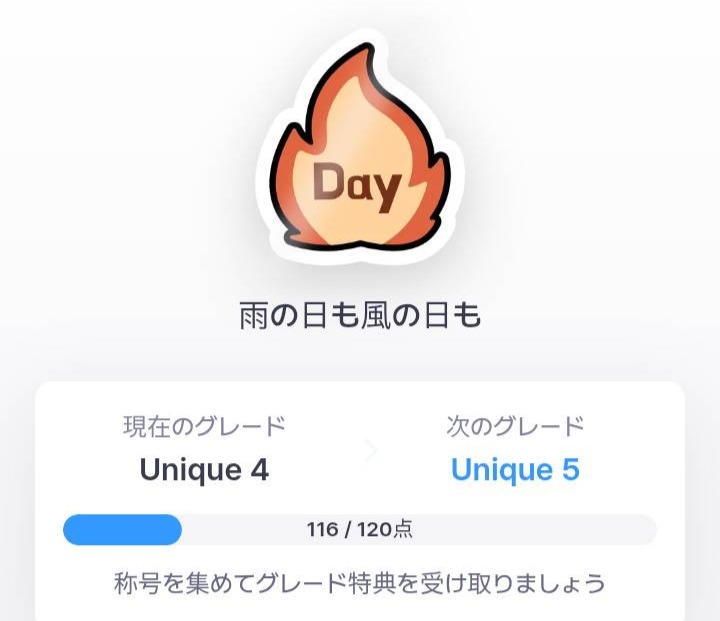 ![]() 雨の日も風の日も | 連続〇〇日運動する(1日1km以上) ※運動回数に関係なく、1日の累積距離が1km以上の場合に反映されます。 ※エナジーを消費した分のみカウントされます。 | レベル1:3日 レベル2:10日 レベル3:20日 レベル4:30日 レベル5:45日 レベル6:100日 レベル7:350日 レベル8:700日 レベル9:1,200日 レベル10:2,000日 |